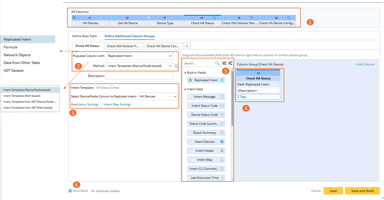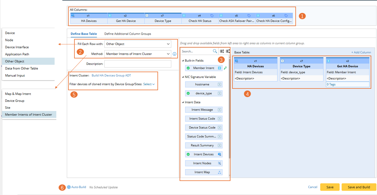 3 Available Fields Drag and drop the available fields to the column group definition area to create ADT columns automatically. 4 Column Group Area The Column Group Area displays the columns assigned to the current column group. Create a new column if none of the provided columns is suitable. 5 Intent Template/ Select Device Column to Replicate Intent In this area, more configurations can be made. The configurations vary according to the method selected.6 Auto-Build Enable the system to update the data for this ADT periodically. 7 Column Data Type Data may function differently in the diagnosis process according to its data type. Users can define the following data type of an ADT column when adding or editing the column:- Basic Data Type: String, Int, Float, Bool, Time