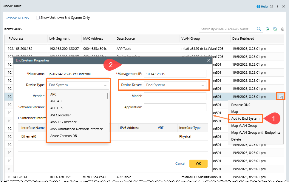 on a selected entry and select Resolve DNS. Resolve the DNS name for a specified unknown end system from the One-IP table.