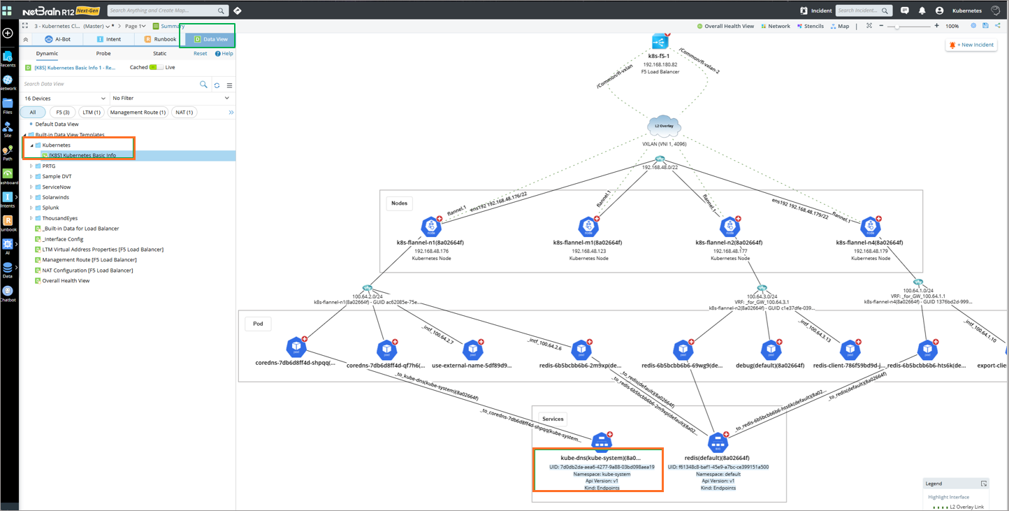 NetBrain provides insight into key Kubernetes data via Dynamic Maps, with the following data tables presented on the map: