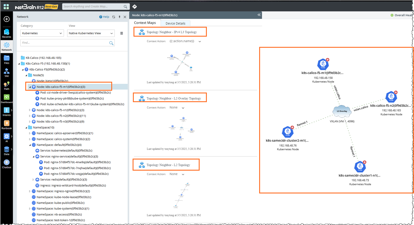 Right-click the node on the map and select View the Context Map. This will display the Context Map, which provides information about Kubernetes Internal/External connectivity. It shows the Dynamic Map based on various scenarios like L3 Topology, L2 Overlay Topology, and L2 Topology.