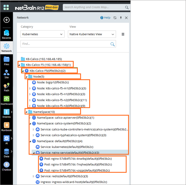 NetBrain supports the discovery of your On-premise, including the Kubernetes Cluster, Node, Pod, Ingress, and Service.