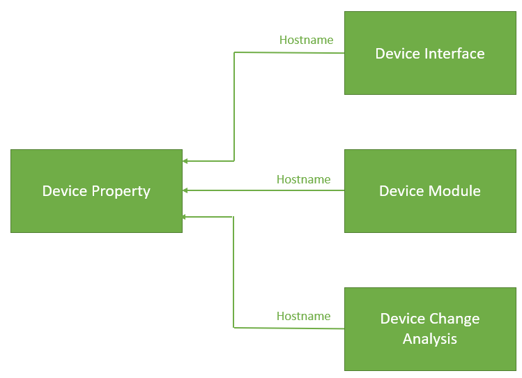In the device category, Device Interface, Device Module, and Device Change Analysis look up to Device Property via the report field Hostname.