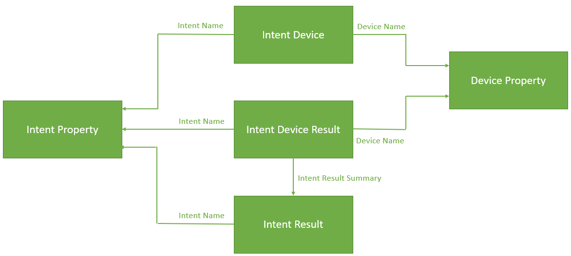 - Intent Device, Intent Device Result, and Intent Result look up to Intent Property via the report field Intent Name.