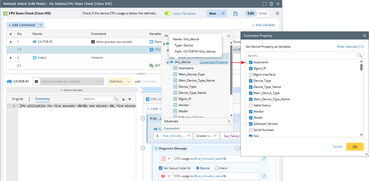 In the variable tree, hovering over the this_device node displays the Customize Property link. Clicking it opens the Customize Property dialog, and any changes you make will be reflected in the variable tree.