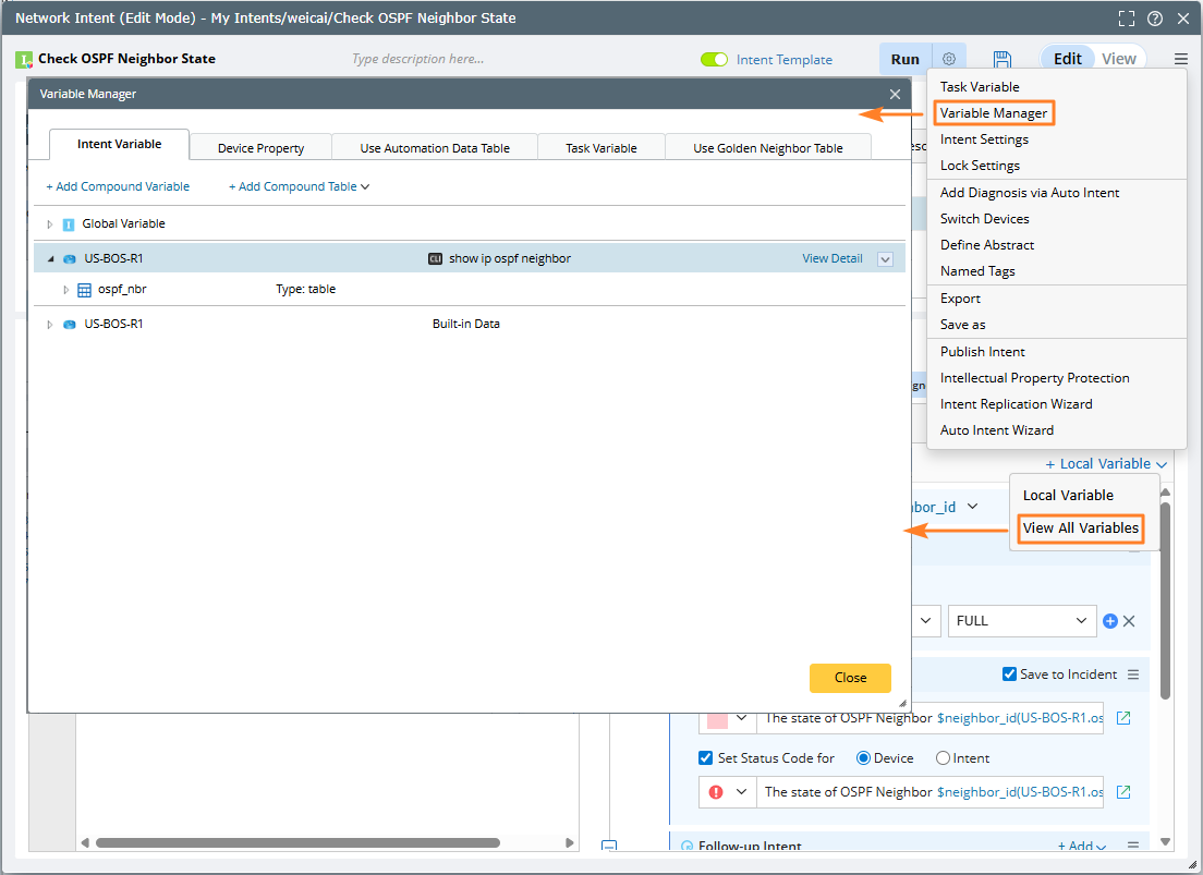 - You can manage intent variables and device variables here.