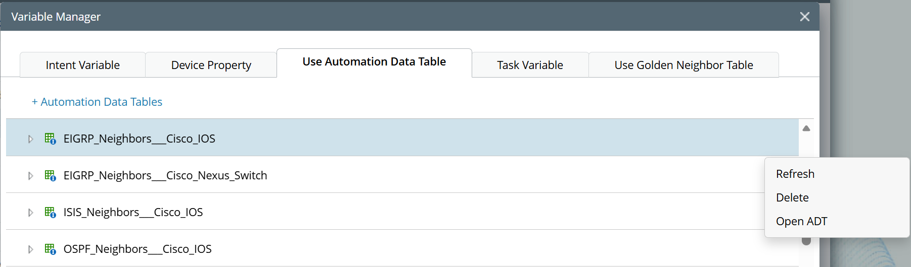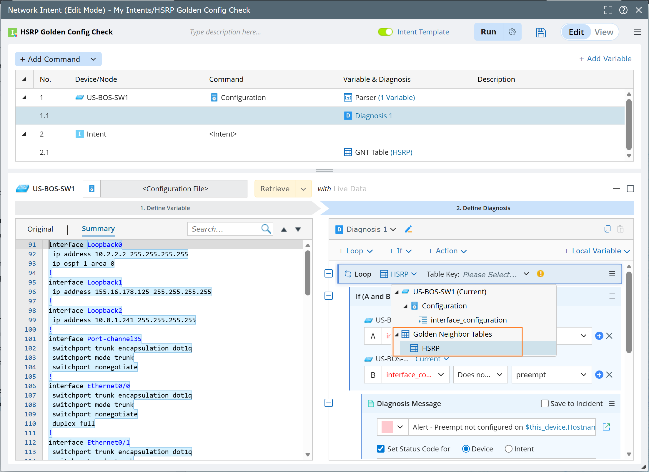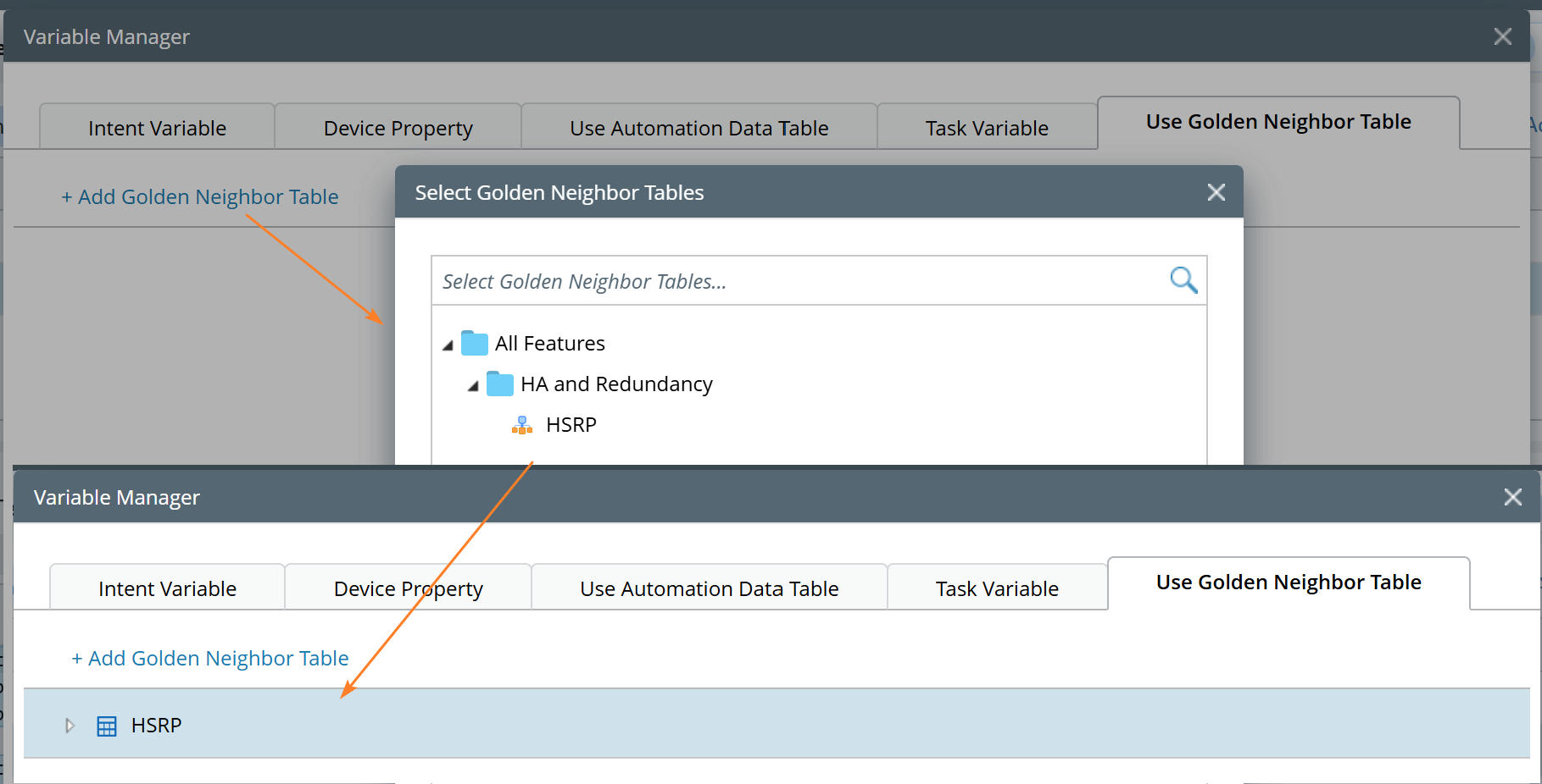 The Golden Neighbor Table is created automatically when a Golden Neighbor enables its Golden Neighbor Settings in GES. You can then use this table in NI to perform diagnostics related to specific features. For example, you can use the Golden Neighbor Table for the 'HSRP' feature to compare the HSRP priority between the device and its neighbor.