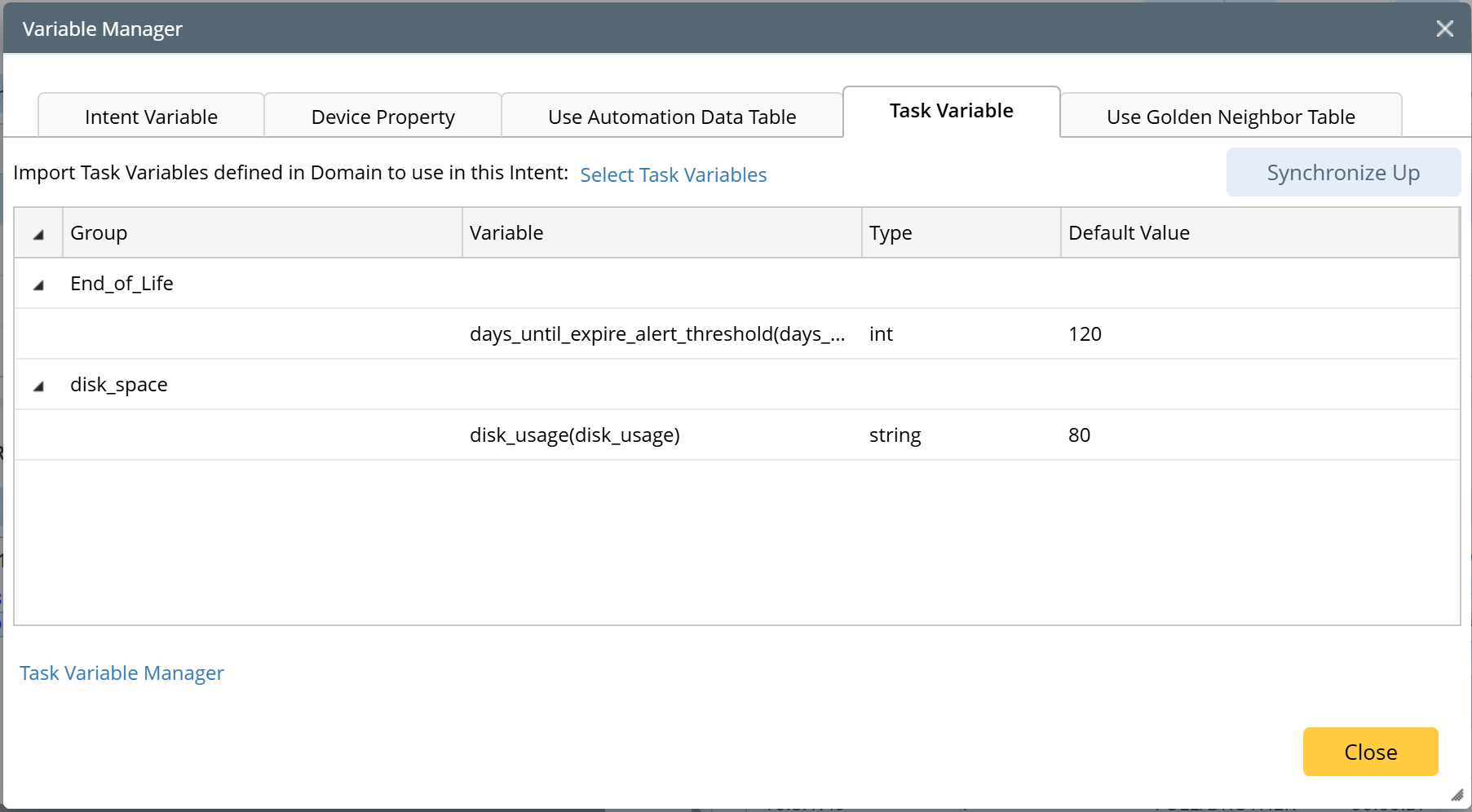 You can import task variables on this tab, then use them for intent definition, and you are also allowed to navigate to Task Variable Manager by clicking Task Variable Manager at bottom-left. See Intent Task Variable for more details.
