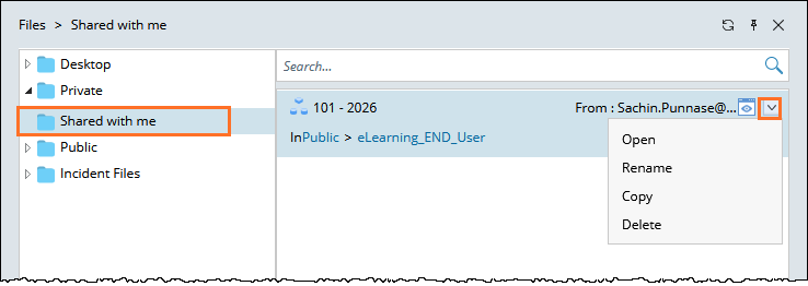 - From the right-click menu, you can open, rename, move, copy or delete a shared file. You can add the file to the personal folder for your convenience.