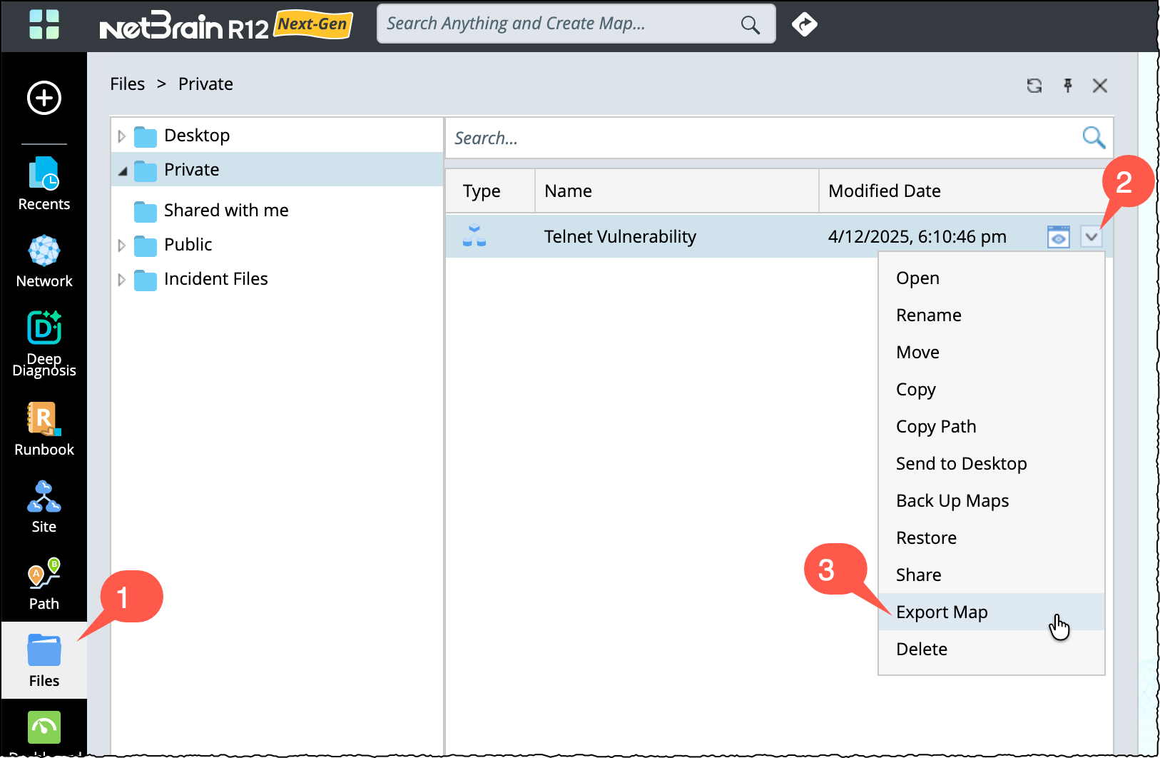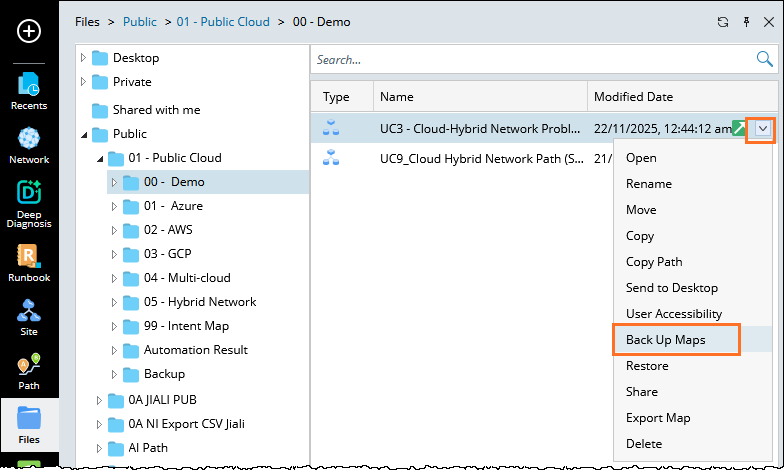 Note: You can also back up maps at the map level. To do this, go to Files, open the required folder, select a map, click the Actions menu, and choose Back Up Maps.