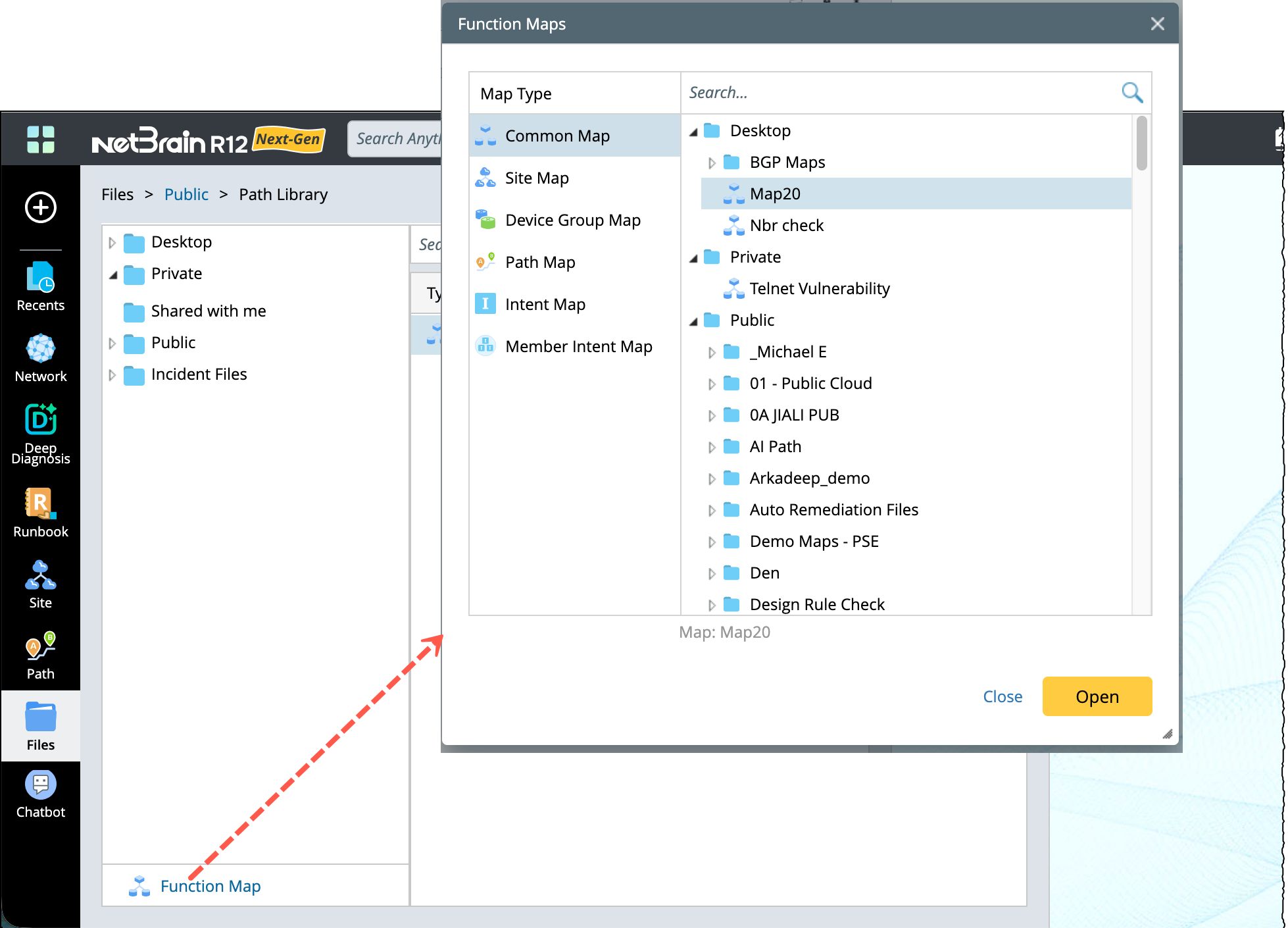 - Function Map — a central place to manage and display all types of maps, including Common Map, Site Map, Device Group Map, Path Map, Intent Map and Member Intent Map. It is located at the bottom of the Files pane.