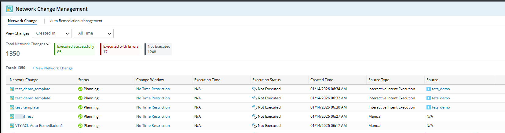 Engineers can view the changes and their status in the Network Change tab in Network Change Management.