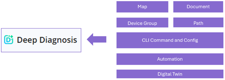 Deep Diagnosis uses different data within the system to identify the root cause during the reasoning process. The digital twin is essential data that includes device property, interface property, L3/L2 neighbors, and One-IP table. The AI uses this data to identify the problem area, and determine which devices need to be checked.