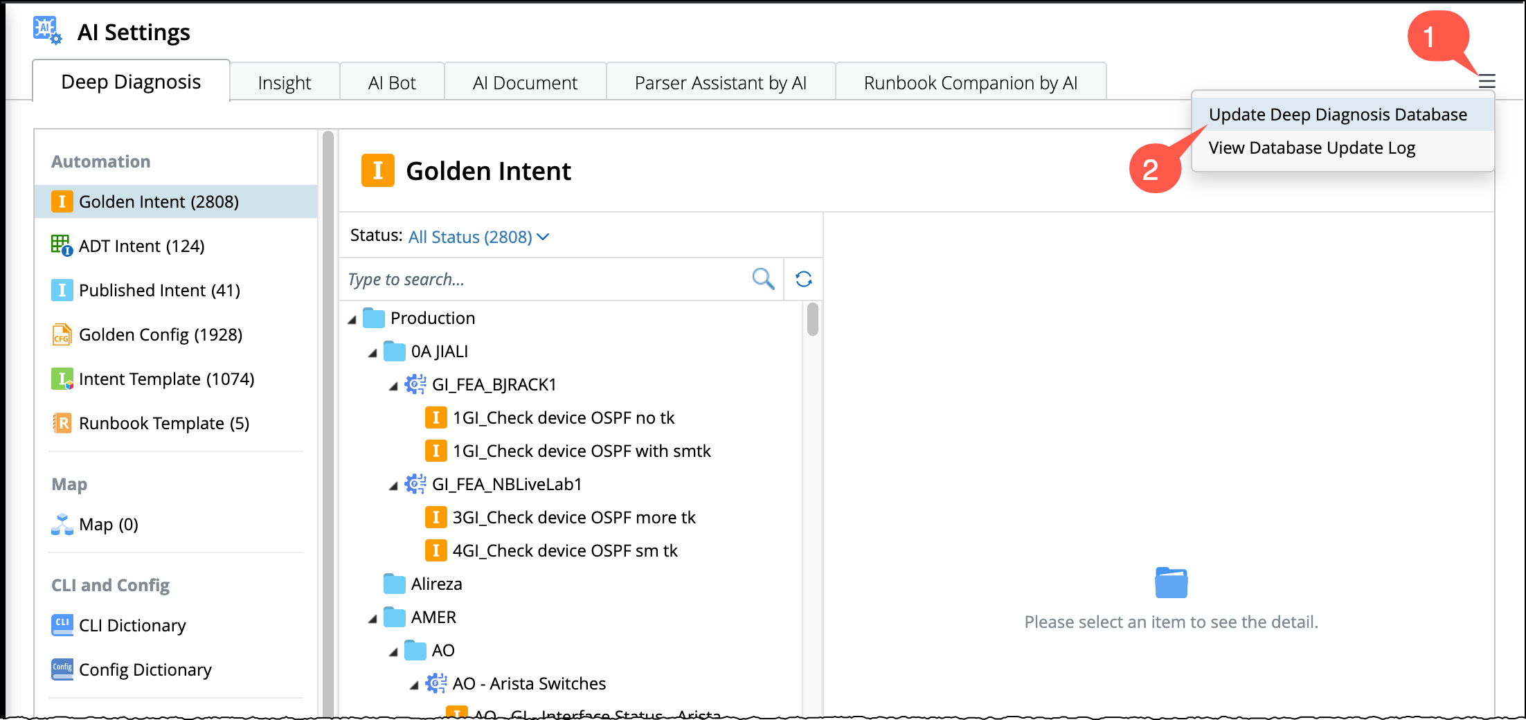 You can manage the diagnostic templates, runbooks, and maps within a centralized workspace inside the AI settings. It is designed to simplify how engineers create, organize, and run automated diagnostic workflows. To begin: