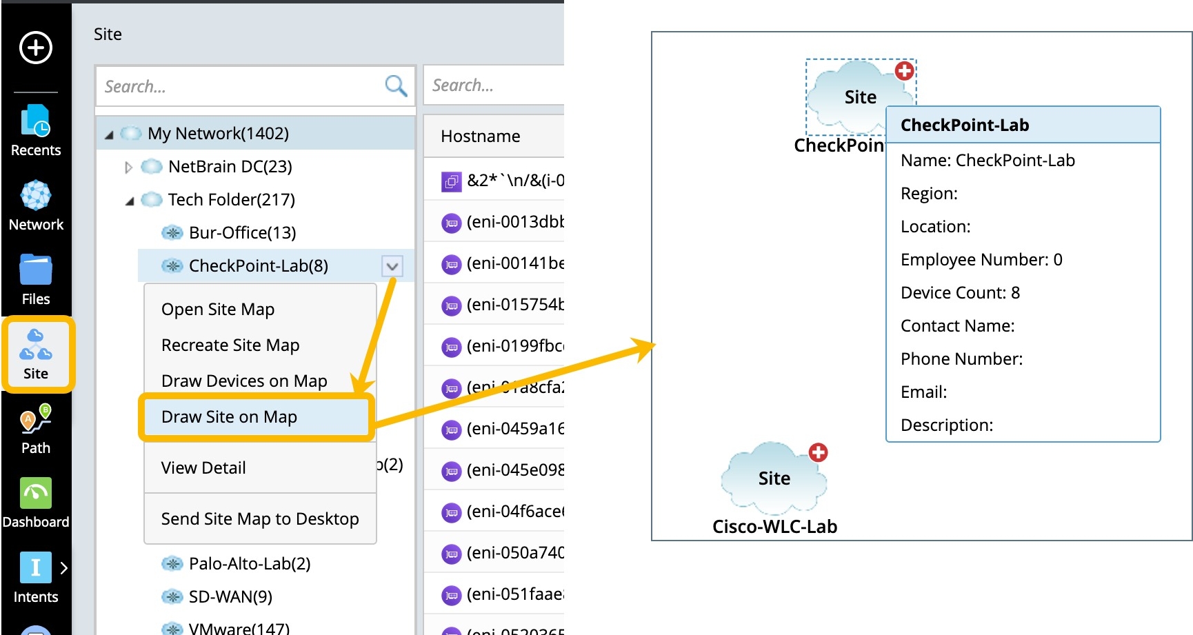 Note: Draw Device On the Map will add the devices in the selected leaf site to the current or new map. Draw Site on Map will add the site's icon to the current or new map. Draw Device On the Map is only available for the leaf site, while Draw Site on Map is available for both the leaf and container site. |
