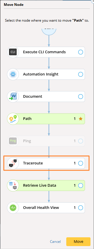 Select an action node to insert the target action node before it, such as Traceroute, and then click Move.