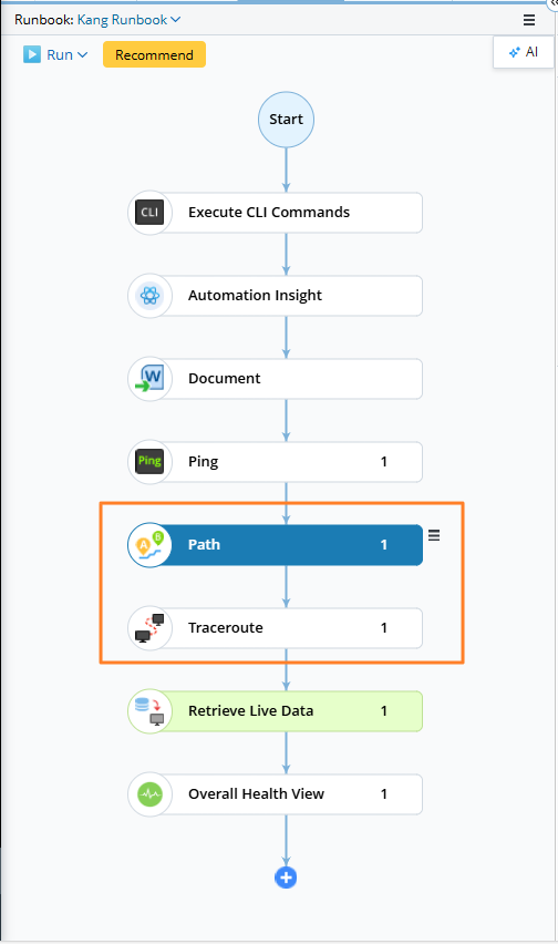 The workflow diagram in a runbook accurately reflects the sequential order that each action is executed. The whole workflow diagram of a golden runbook is usually the recommended guideline for network engineers to diagnose a type of network issue step by step. However, sometimes, you might want to move a certain action node forward or backward to make the whole workflow diagram more reasonable and realistic. For example, after Merging Duplicated Action Nodes, the workflow might change significantly. You can adjust the order of the action nodes based on your judgment.
