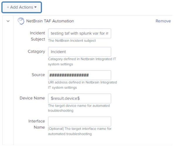 - Click Add Actions and then the list of automation that is supported will be available. Choose the Netbrain TAF Automation from the list.