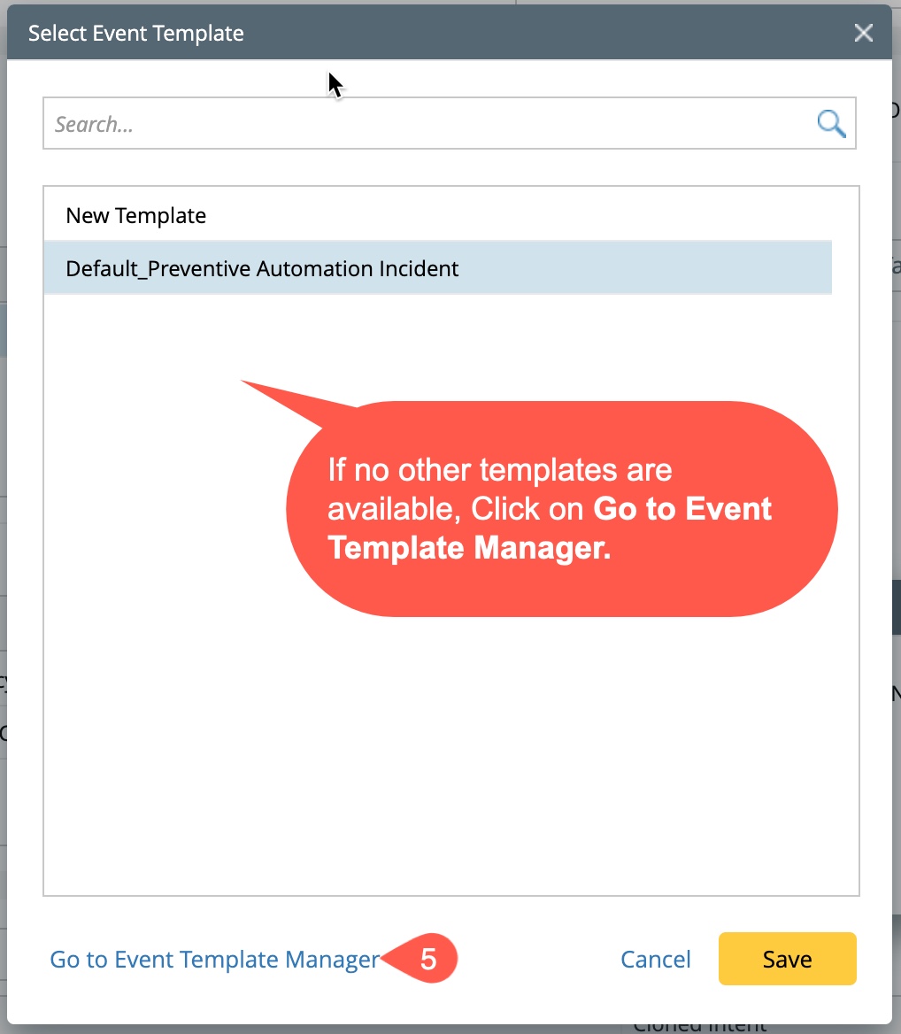 - Click on the event template Default_Preventive Automation Incident to open the window Select Event Template with a list of event templates.