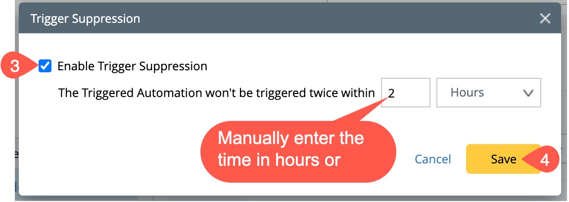 - Check the check box to Enable Trigger Suppression and manually enter the time.