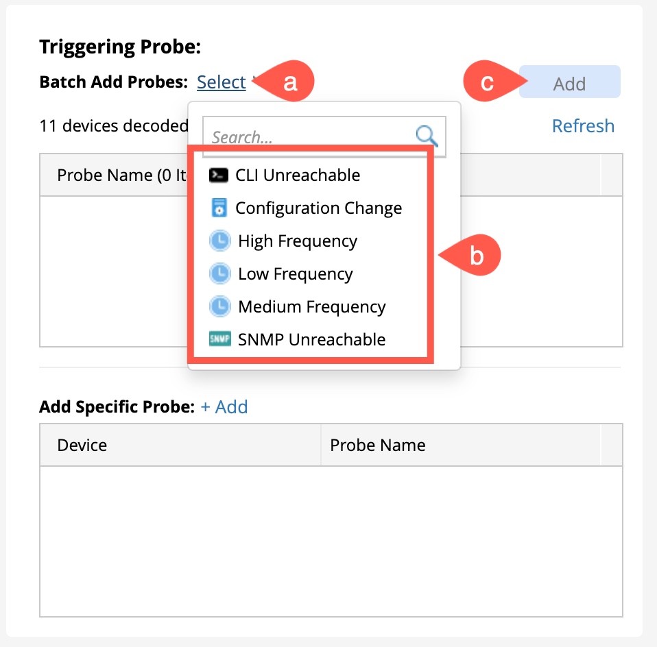 - To exclude devices from the batch, click on the probe count to open a window Add Probe by Name Across All Intent Devices.