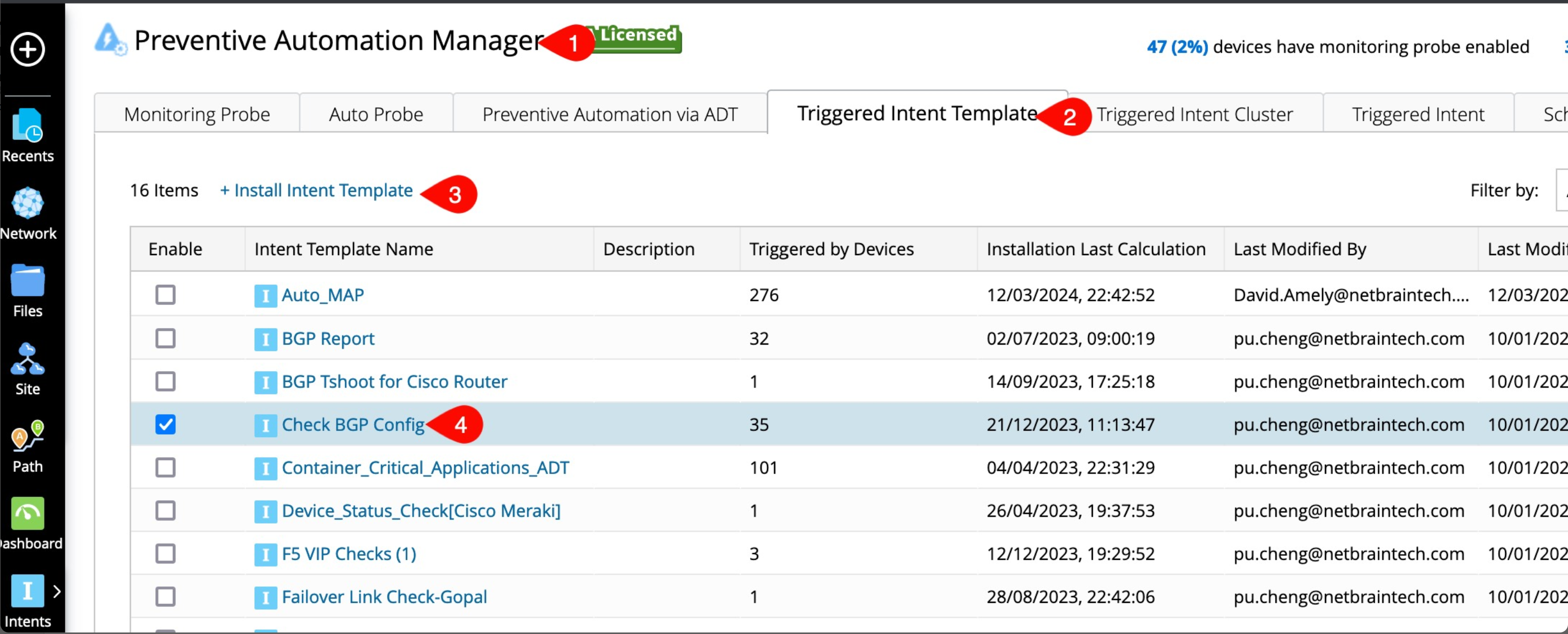 To trigger an NIT using a probe, a feature Triggered Intent Template is provided in the Preventive Automation Manager.