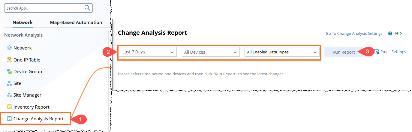 - Specify a time range, device scope, and data type for the change analysis report. Only device types enabled in Change Analysis Settings can be selected for the report.