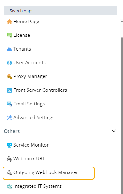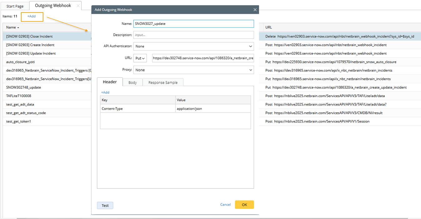 Outgoing webhook can be created and used in NI definition to push the data and execution results in NI to third-party application, connecting our system to third-party system. Outgoing Webhook Manager is central place for creating and managing outgoing webhooks in the domain. After outgoing webhook is defined, in NI execution, you can use Webhook Call to send alerts to external ticket system. For more information, see Call Webhook API.