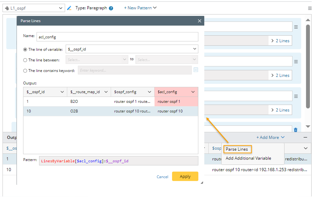 To add these functions, go to the Output area and click + Add More > Parse Lines.
