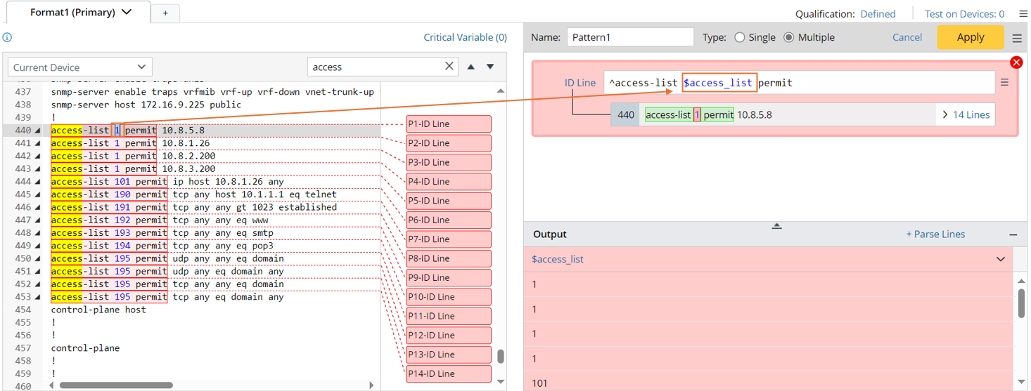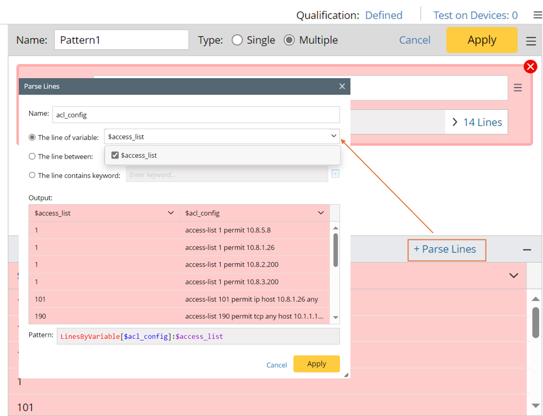 Example 1: Parse the lines containing a single variable, e.g., parse acl config per line.