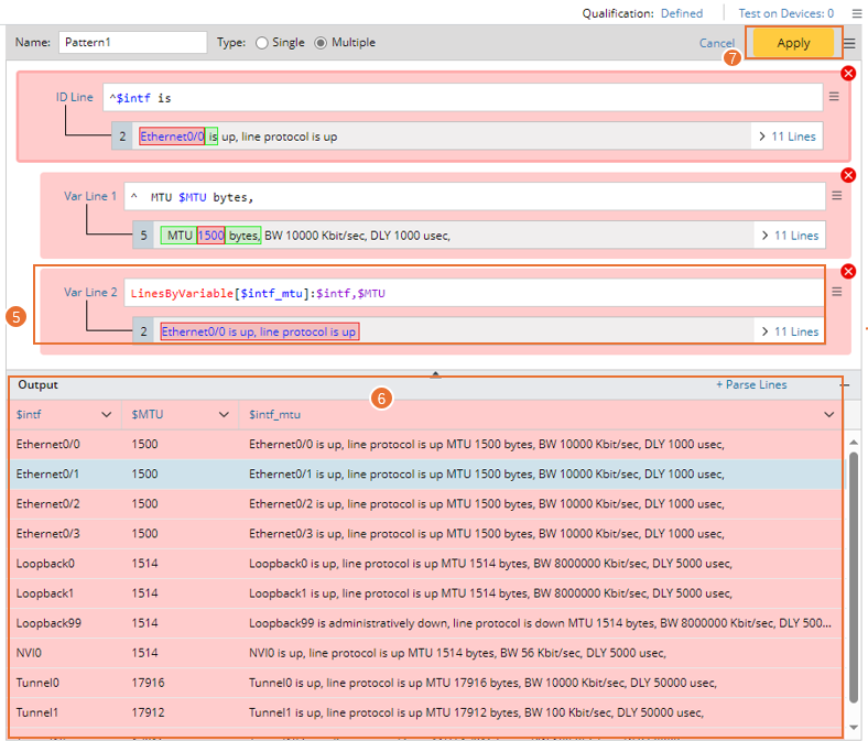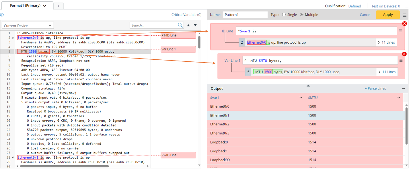 - Double-click Ethernet0/0 in line 2, then continue to double-click 1500 in line 5 to parse the variables $intf and $MTU in the Auto Parser mode.