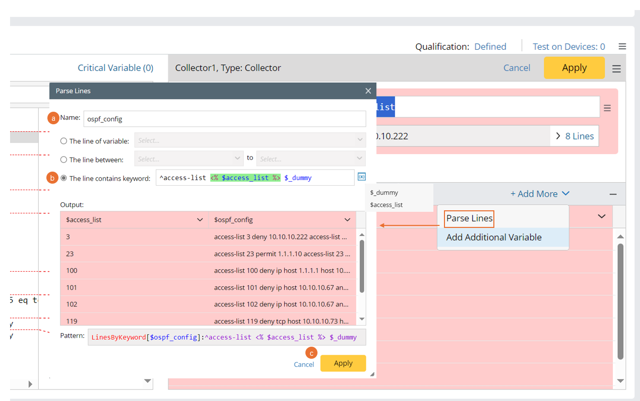 - Select The line contains keyword option, then input ^access-list. Click to select $access-list, then continue to input $_dummy. after these settings, a var line LinesByKeyword[$ospf_config]:^access-list <% $access_list %> $_dummy is added.