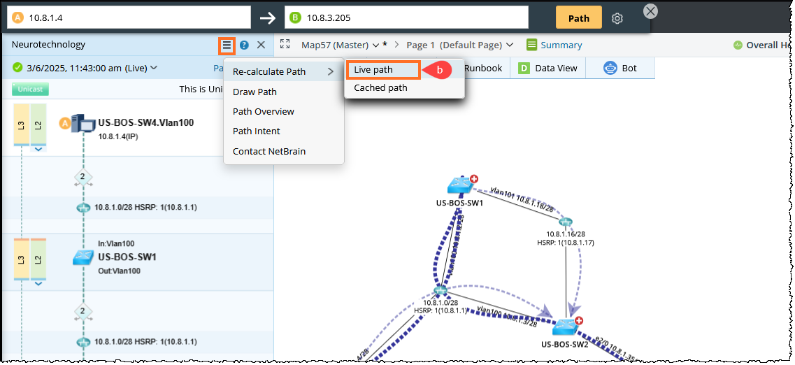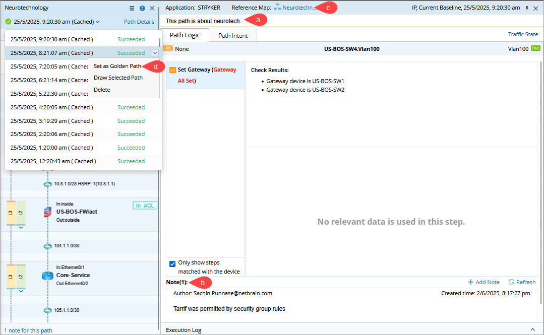 You can select one path to view its results on the map, including the Path Description, Note, Path Reference Map, and Path Logic. - Perform Drill-Down Analysis: Calculate live Path and Compare with Cached Path (During troubleshooting)