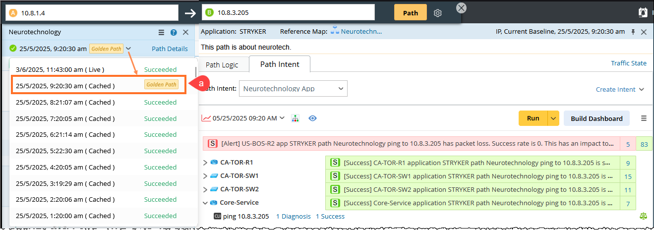 Note: If the live path deviates from the cached or golden path, especially under normal network health, it may indicate a failover. This could potentially lead to performance issues (e.g., slower applications due to limited backup link bandwidth).