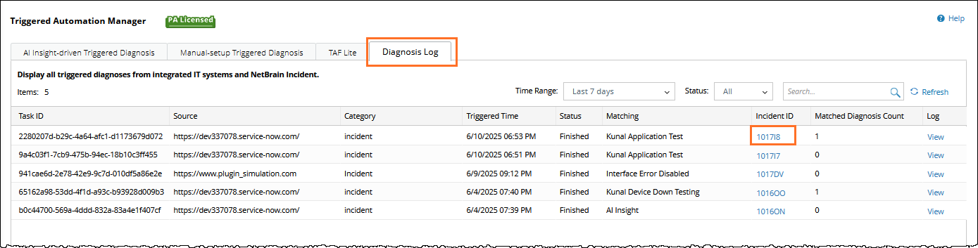 The incident details will open, allowing you to review the results of the triggered diagnosis.