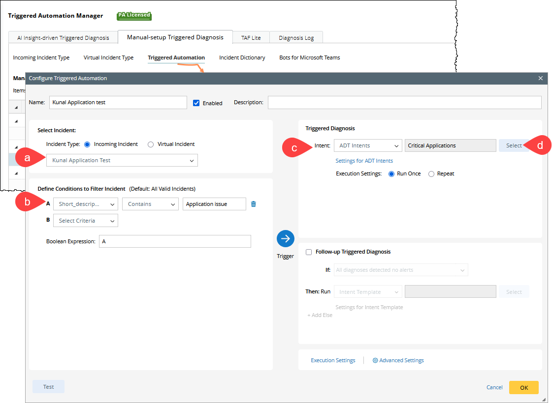 To manually configure triggered diagnosis:- Select Incoming Incident link from the dropdown.