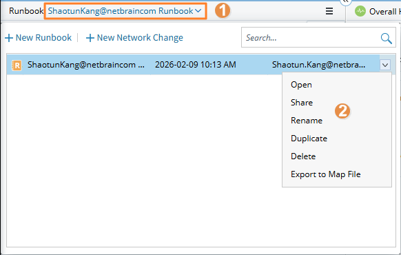 The system creates a built-in runbook for each map to accommodate all automation actions executed by a specific user when no runbook is open. The built-in Runbook is named with the current login email address, which means each user can have a personal runbook on each map.