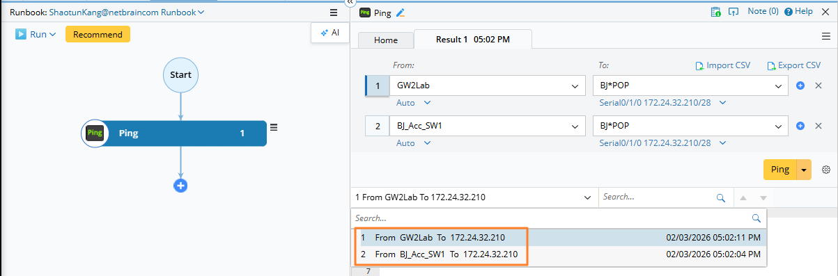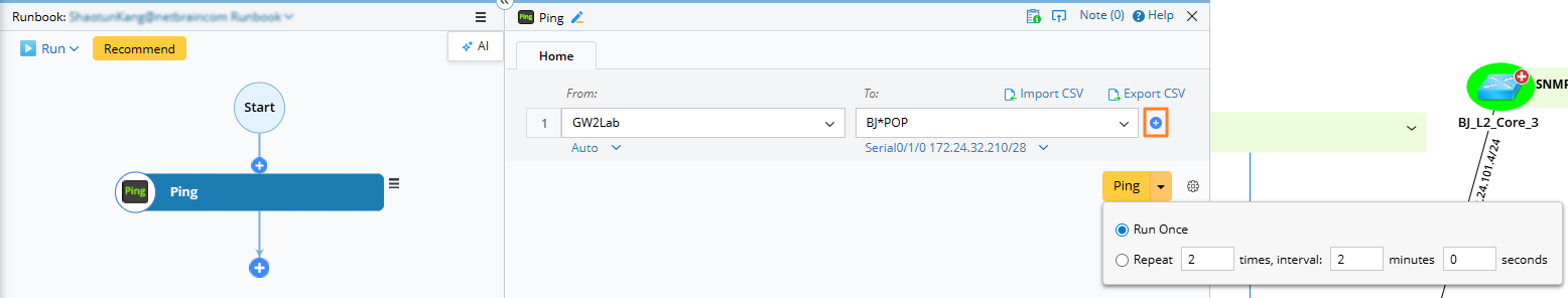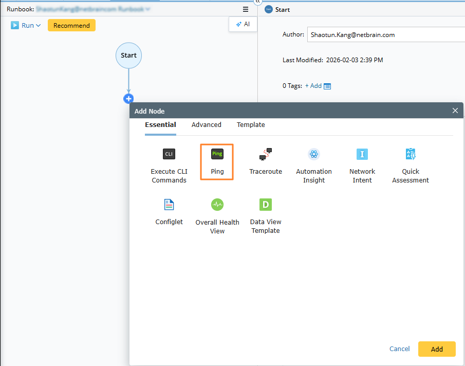 Select Ping from the list of available nodes and add it to the runbook.