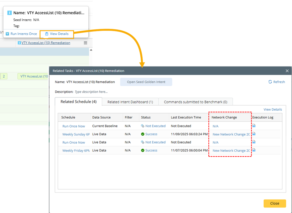 - To navigate to the change runbook, click View Details and select a network change. (See Use PA Remediation for details on how to configure Preventive Automation Remediation)