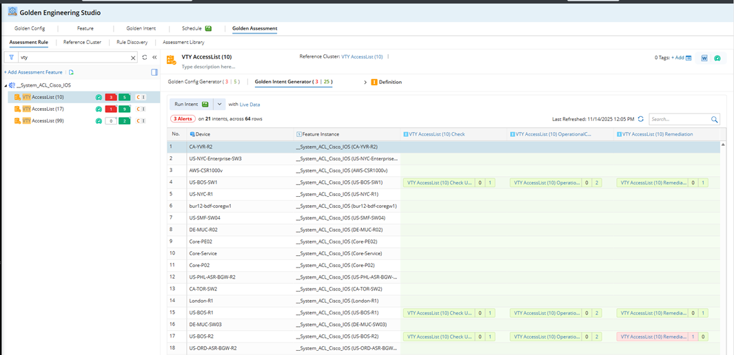 An engineer has discovered a set of golden rules for VTY access-list in our domain. He has also built golden intents with remediation logic as follows.