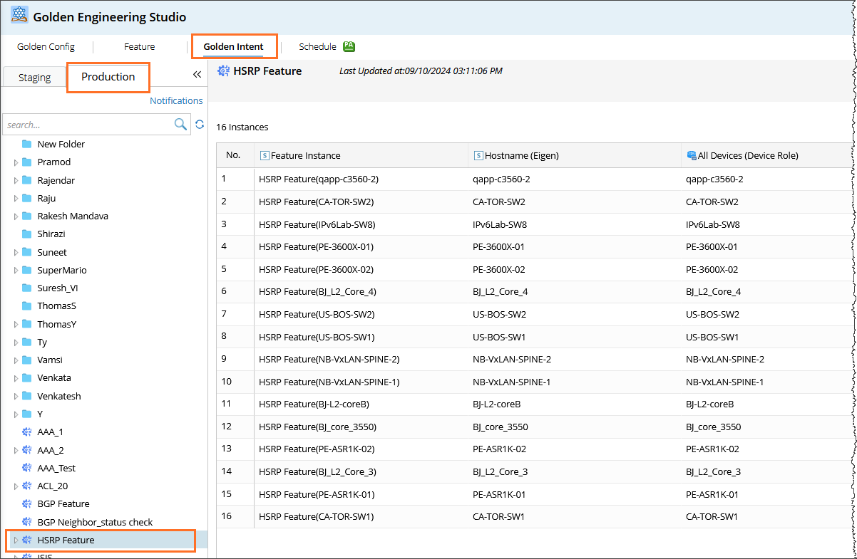 - The published golden feature will be pushed to the Golden Intent > Production environment. And the golden feature can be utilized for defining the Golden Intent.