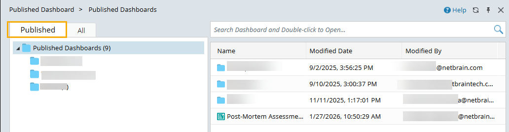 Once published, these dashboards are duplicated and stored in the Published tab, separating them from case-based troubleshooting dashboards for easier distinction, making it easier for you to view and manage company-wide dashboards.