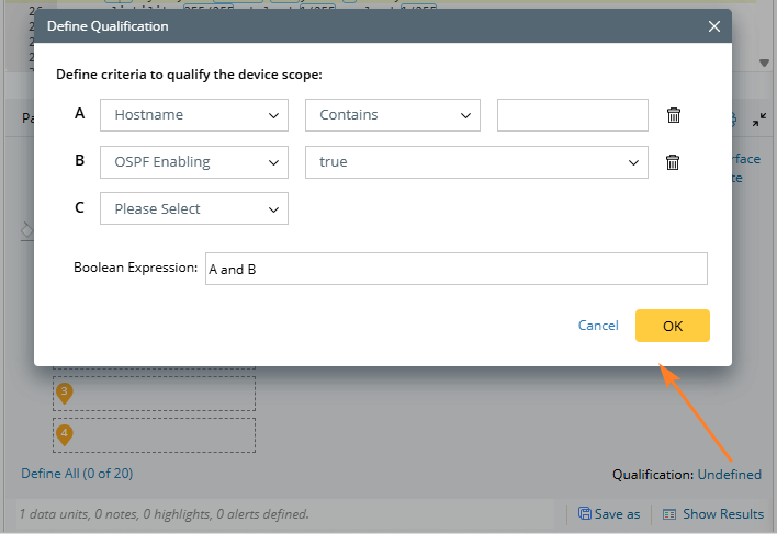 You can define qualifications in the Execute CLI Commands node to refine the scope of target devices. These qualifications help ensure that automation is executed only on target devices that meet specific criteria.