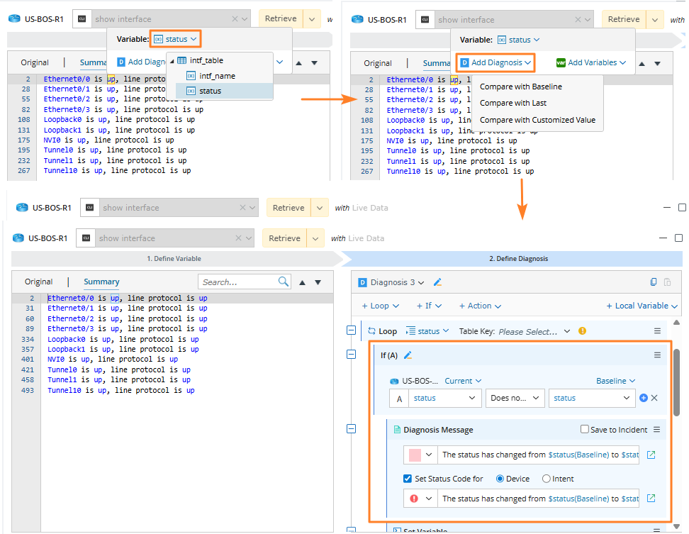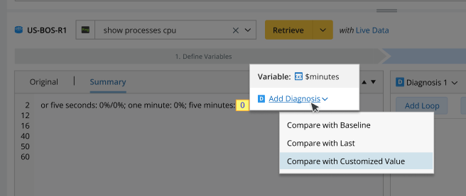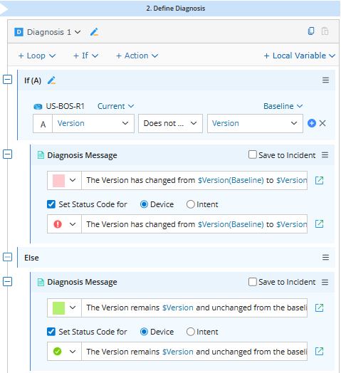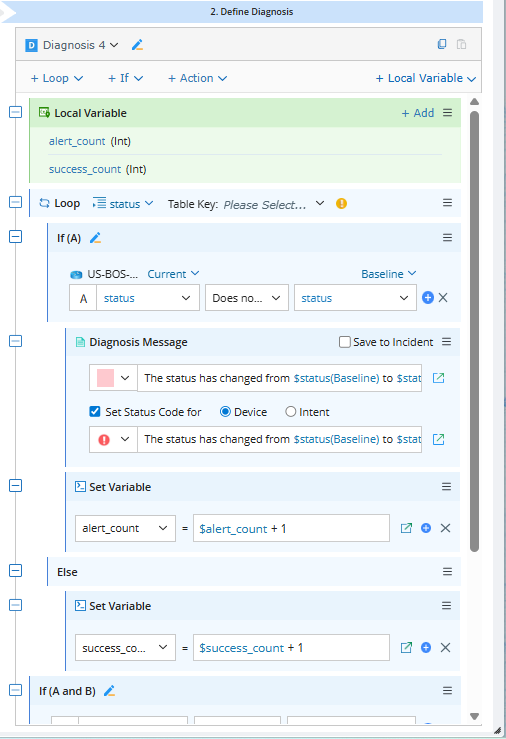 | Table Column | Compare with Baseline Compare with Last Compare with Customized Value | Local Variable Loop If Diagnosis Message (Alert) Else Diagnosis Message (Success) If Diagnosis Message (Success) ![]() |