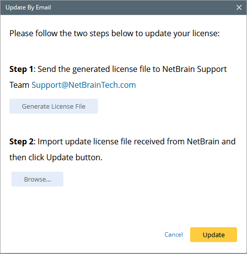 - Refresh By Email — This method will Refresh your subscription license by sending an email to NetBrain. Use this refreshing method only when your Web API Server cannot access the Internet.