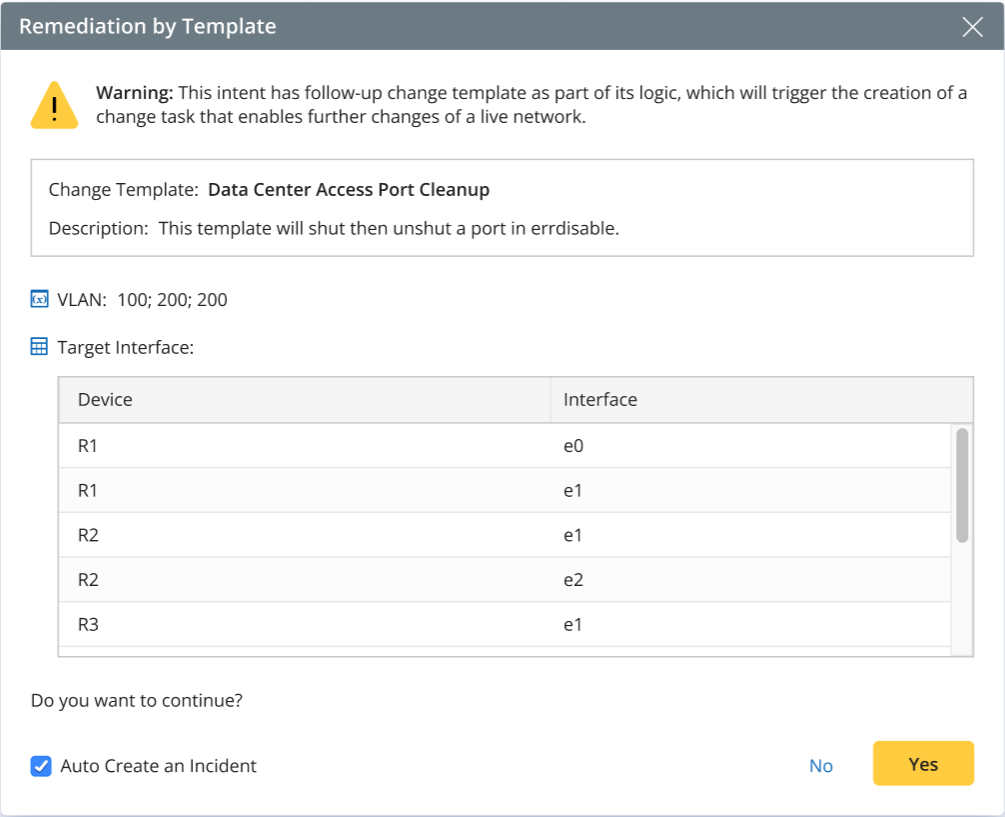 R12.3-2026Apr21 Remediation Confirmation Dialog If NI remediation is defined using Remediation by Template, only brief information is displayed in the Confirmation window. You can review the CM Task in detail after it is created to see which devices are involved and what changes will be applied. Assign Template Variable Value Using NI Variable Manual Remediation for Unplanned Change