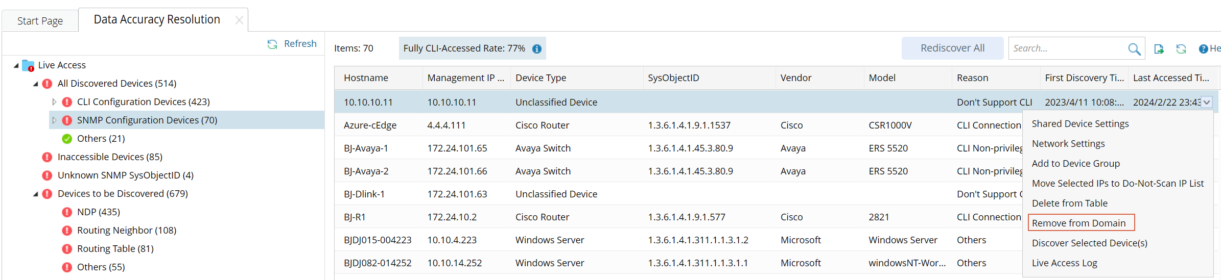 - On the Tune Live Access tab, open the fine tune result table, check the box and right-click the target device to select Remove from Domain.