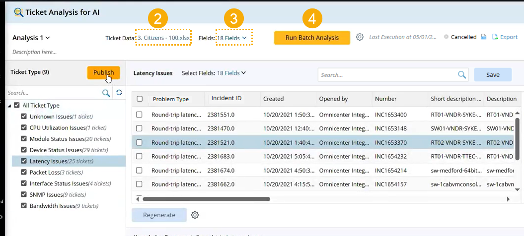 - Run batch analysis. The LLM will analyze the selected ticket fields, categorize tickets by ticket types, then generate ticket variables, knowledge documents and prompts.