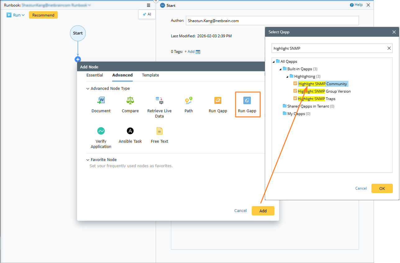 - On a map, go to the Runbook pane and add a Run Gapp node.
