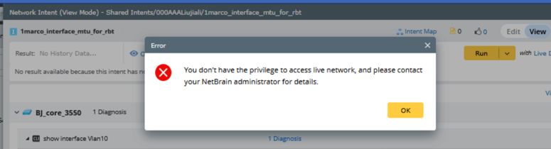 If the data source is set to Live Data, you must have both the Run Intent privilege and the Access to Live privilege. If the Access to Live privilege is missing, the following alert will be displayed.