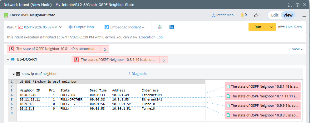 You can get much information from the NI result. For example, you can view the Diagnosis Details and Compare Pane. See More Actions after Executing Network Intent for details.